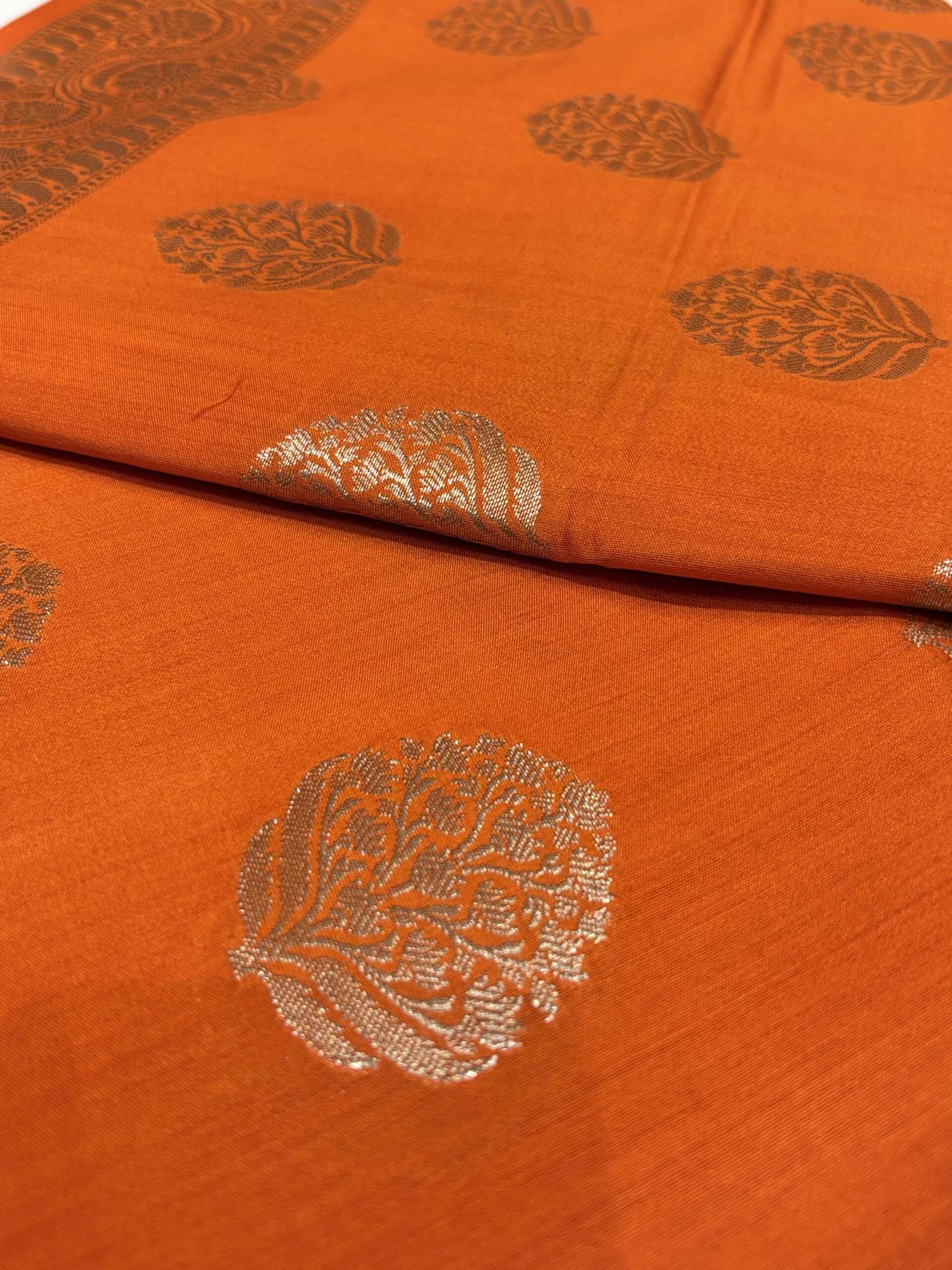 Banarasi sarees, originating from Varanasi, have roots dating back to the Vedic period. Known for their rich, lustrous texture, these sarees feature intricate designs woven with zari—real gold or silver threads, or metallic threads coated in gold or silver. Popular motifs include kalga, buti, jhallar, and mina, often crafted using brocade and colored silks.